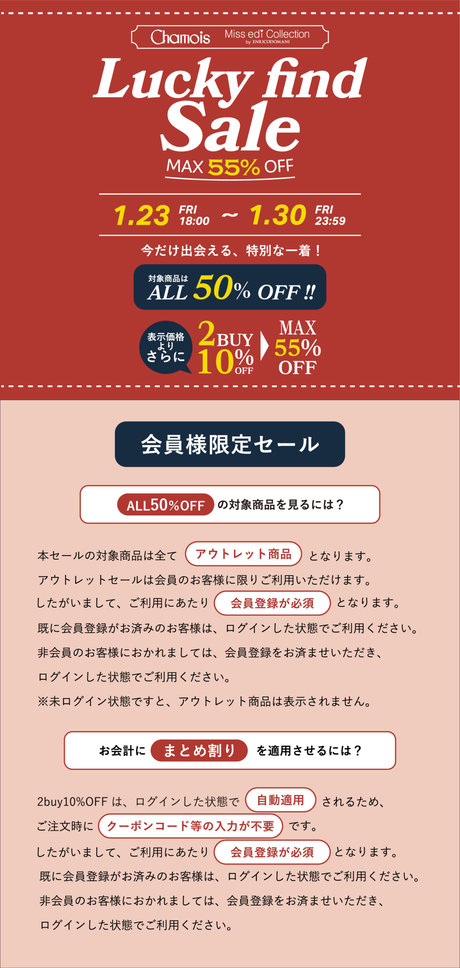 ※≪2buy10%OFF≫の適用に関しましてはログイン後、注文内容の確認画面で割引が自動適用されます。(適用条件:対象商品を1会計で2点以上のご注文)【 対 象 期 間 】1月23日(金)18:00 ~ 1月30日(金)23:59【 対 象 シ ョ ッ プ 】ミスエディコレクションシャミー【 対 象 商 品 】アウトレット一部商品≪ 注 意 事 項 ≫ご注文を確定する前に、注文内容の確認画面にて(1)お会計(金額表示欄)にキャンペーン・クーポン割引が適用されている(2)画面下部のキャンペーン1の箇所に【≪ミスエディ&シャミー≫LUCKY FIND SALE | 2BUY10%OFF】のチェックが入っている上記2点を必ずご確認ください。 価格は予告なく変更になる場合がございます。 あらかじめご了承ください。全ての対象商品はこちら※対象商品一覧は全てアウトレット商品となります。アウトレットセールは会員様限定となりますので、ログインした状態でご利用ください。新規会員登録 / ログインはこちら 《注意事項》※商品の購入金額から割引が適用されます。※他のクーポンとの併用はできかねます。※他注文(他会計)との商品点数の合算は不可とさせていただきます。※購入確定前に注文内容の確認画面にて、キャンペーン割引にチェックが入っているかご確認をお願いいたします。※価格は予告なく変更になる場合がございます。あらかじめご了承ください。 新規会員登録はこちら 会員サービスについて シェアする Loading... シェアする 閉じる 一覧に戻る 未入力の が 件あります ホーム 特集一覧 会員限定【LUCKY FIND SALE】≪ミスエディ&シャミー≫対象商品ALL50%OFF | 2BUY10%OFF