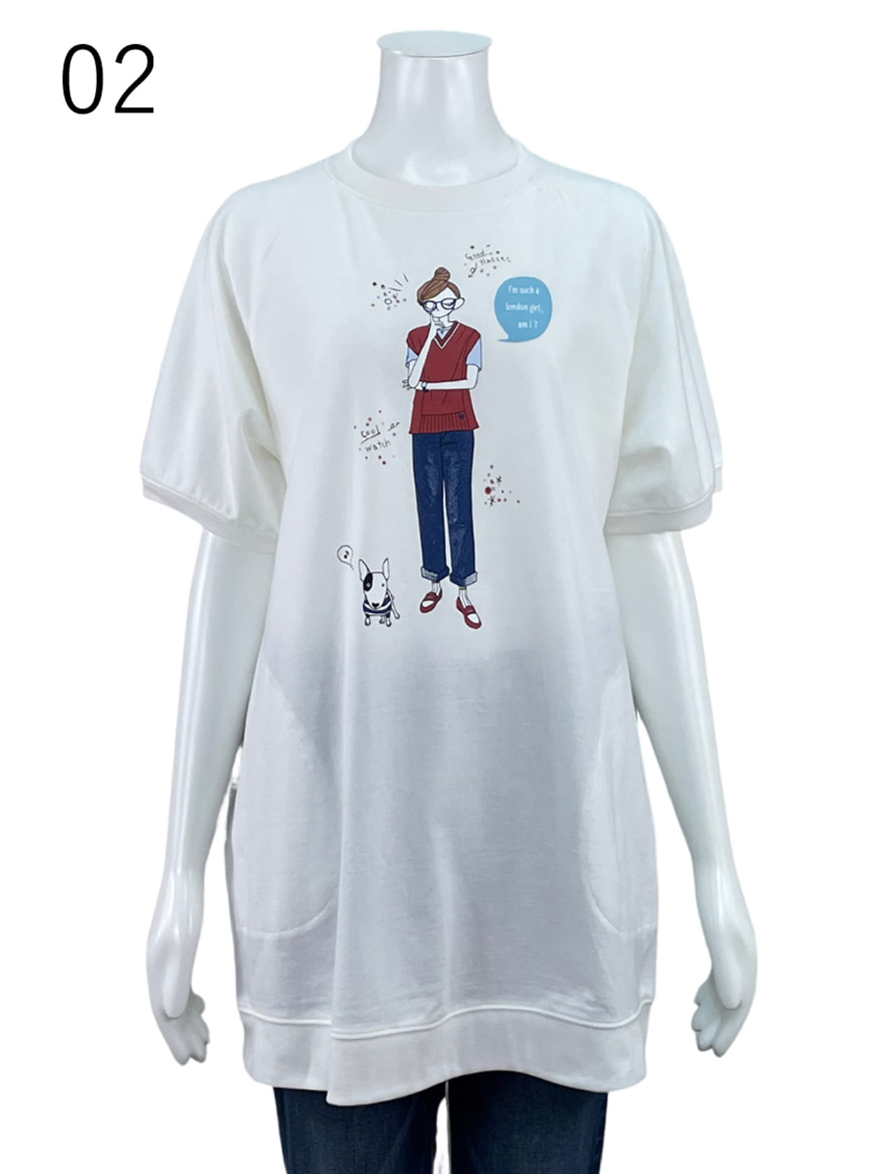 綿100%の膨らみの有る素材を使ったチュニック丈カットソープルオーバー。ラグランスリーブで、やや長めの半袖にしています。77cmのチュニック丈で、衿と袖口、裾にはフライス素材を使用し、より着やすく仕上げています。前身頃にはediちゃんとHAPPY君のプリントが入ったおススメのカットソーです。脇のシームポケットもポイントです。