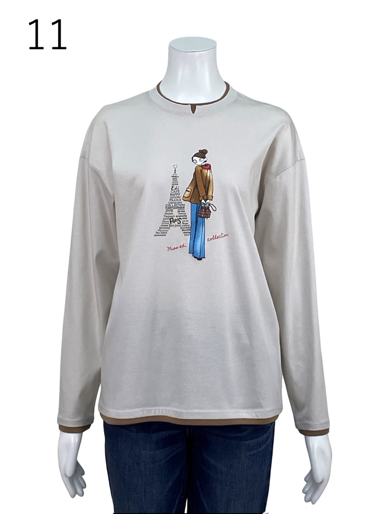 夏のTシャツで定番の「ZOCCON」のスムース版を使用した秋のTシャツ。衿・袖口・裾を配色生地で二重にし、重ね着しているようなデザインに仕上げています。エッフェル塔と振り向き姿のエディちゃんのプリントは少しセンチメンタルで大人っぽい雰囲気を表現しました。*サンプル品のため、特別価格でのご提供です。 *サンプル品のため、小さな傷や汚れがある場合がございます。 *本生産商品と仕様や取り扱い表示・組成表示が異なる場合がございます。 *ご購入後の返品・交換はできません。