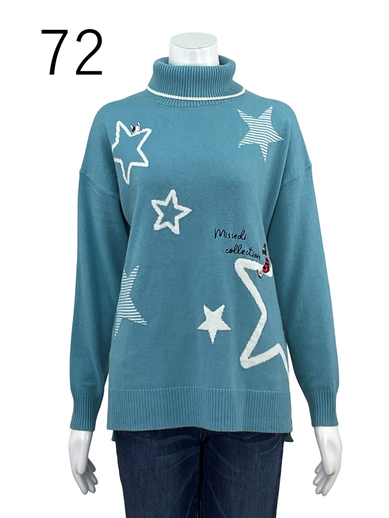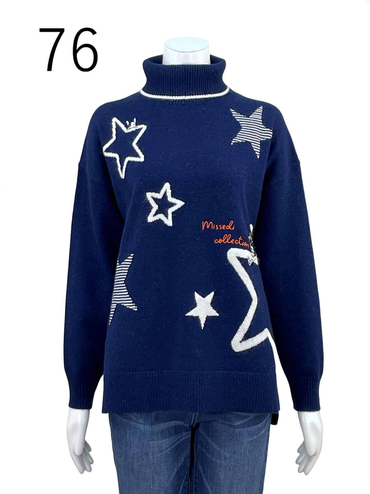 アンゴラ混の糸を使ったハイゲージニット。前身頃に星モチーフを散りばめたインターシャ柄を施しました。星に乗ったエディちゃんの刺繍が可愛いプルオーバーです。高すぎないハイネックとニュアンスのあるカラー展開がおススメ。スリムパンツと好相性です。*サンプル品のため、特別価格でのご提供です。 *サンプル品のため、小さな傷や汚れがある場合がございます。 *本生産商品と仕様や取り扱い表示・組成表示が異なる場合がございます。 *ご購入後の返品・交換はできません。
