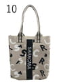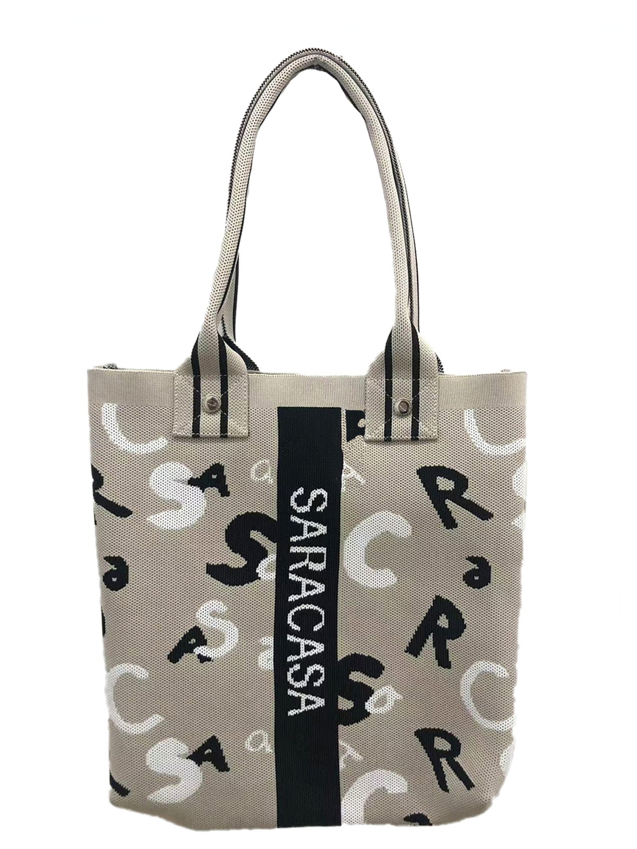 素材は細かなメッシュ状のポリエステルジャカード。saracasaの構成文字をランダムに配置したオリジナルジャカード使用。中央にはストライプ切り替え+ブランドロゴの織り込みデザイン。持ち手はボディ色ベースに細いストライプを配した配色テープ使用。