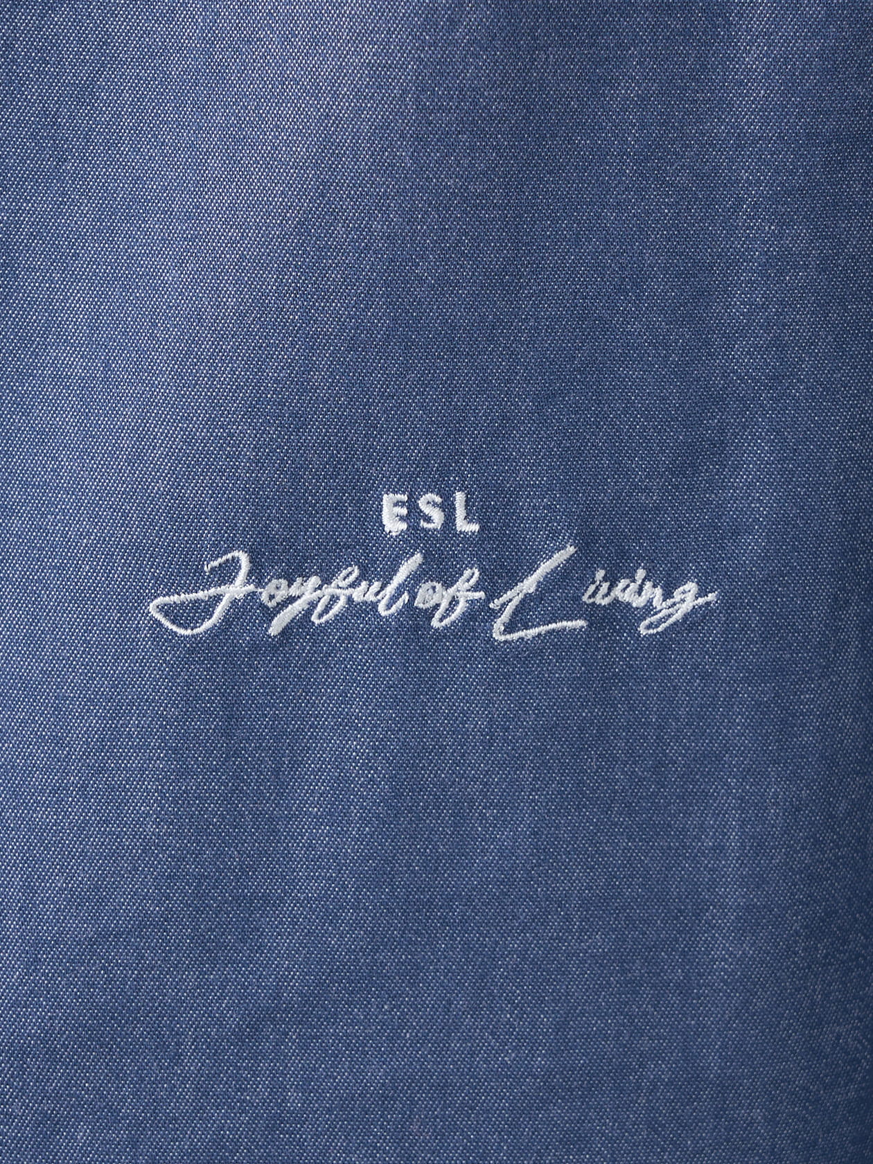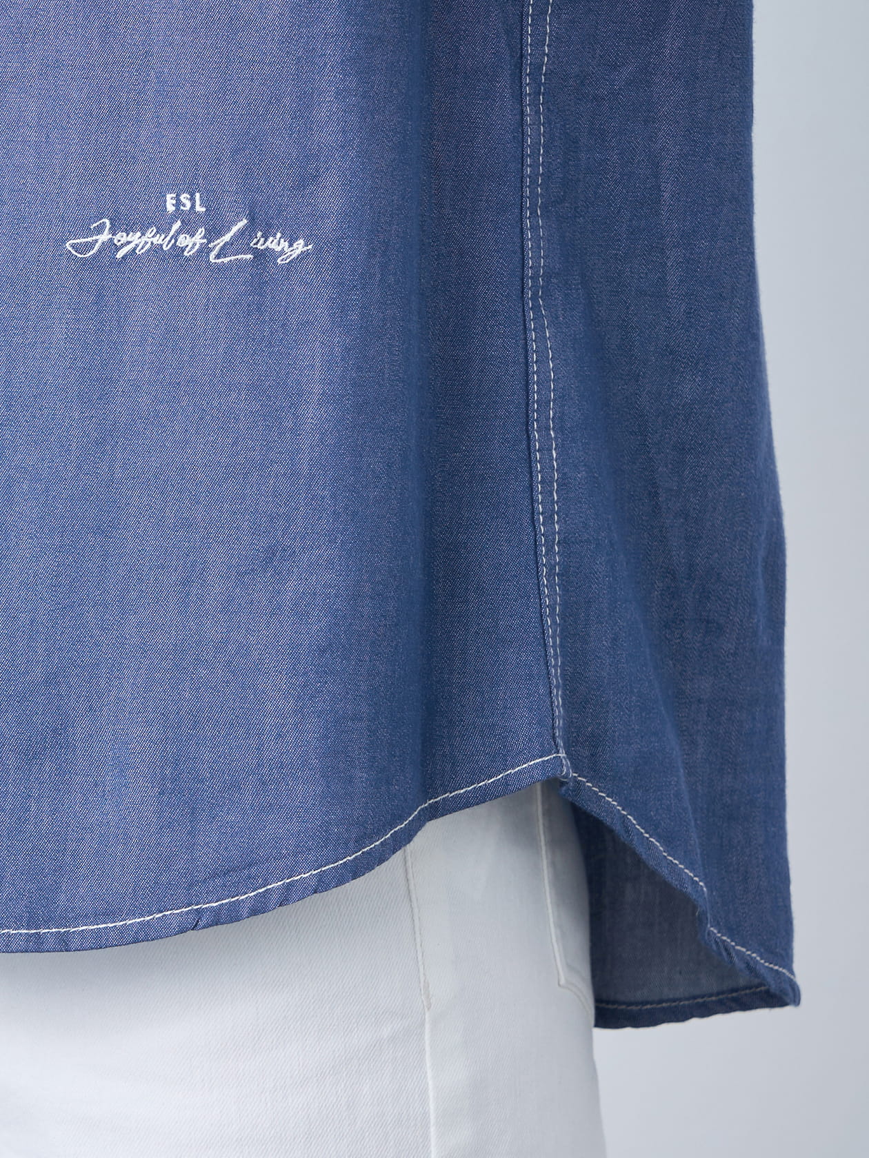 ゆったりとしたオーバーサイズなので軽やかな羽織アイテムとしても活躍します。色落ちの心配が無いので白いインナーやボトムにも気兼ねなく合わせていただけます。左裾に施した刺繍「joyful of living」がアクセントになっています。